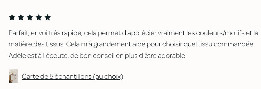 Pour vous aider à faire votre choix, commandez jusqu'à 5 échantillons de 10x10 cm, de vos tissus préférés, gratuitement !
