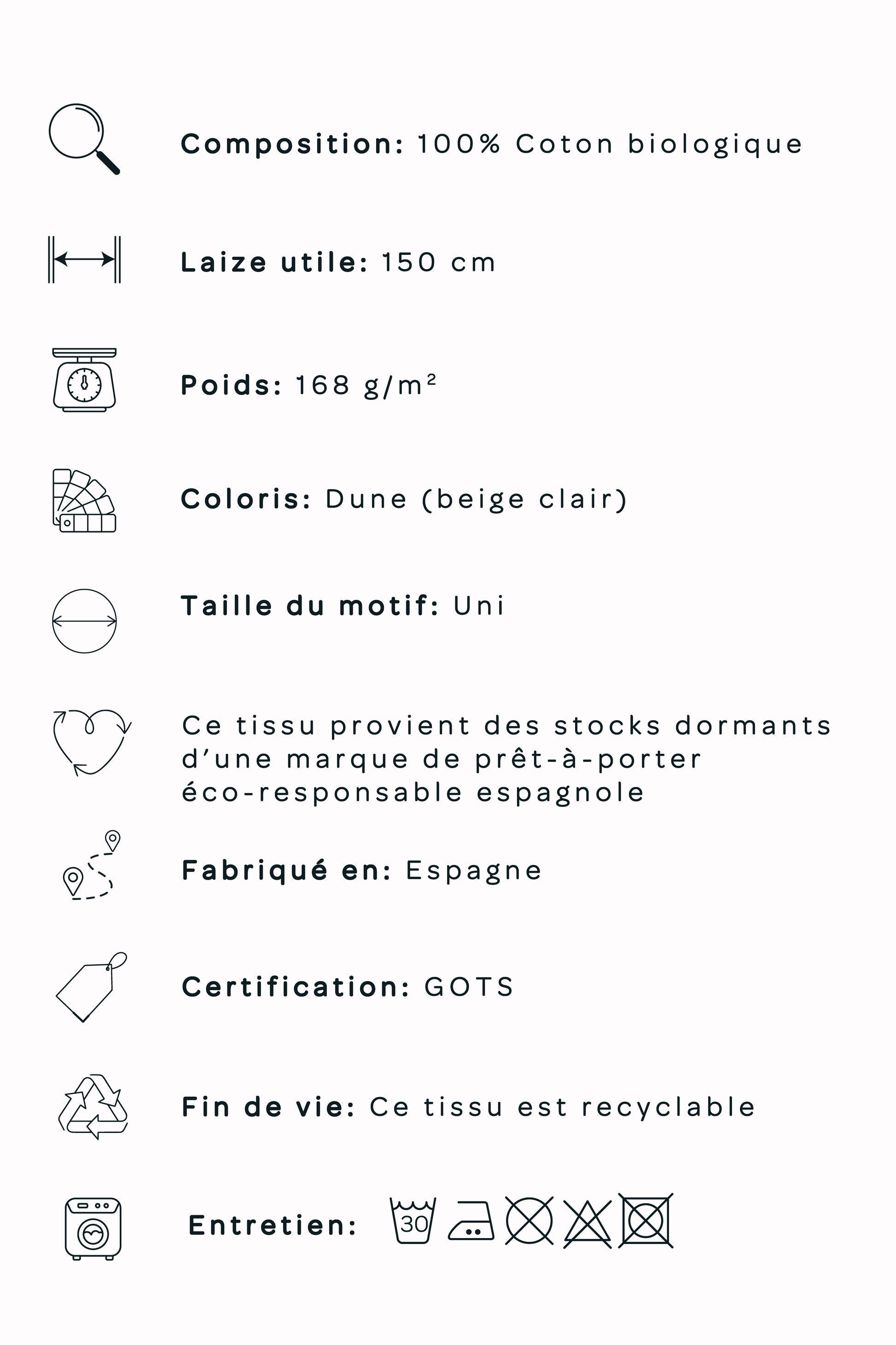Cette flanelle de coton biologique, avec sa nuance Dune (un beige clair lumineux), et sa douceur sera parfaite pour coudre des pièces aussi élégantes que confortables.