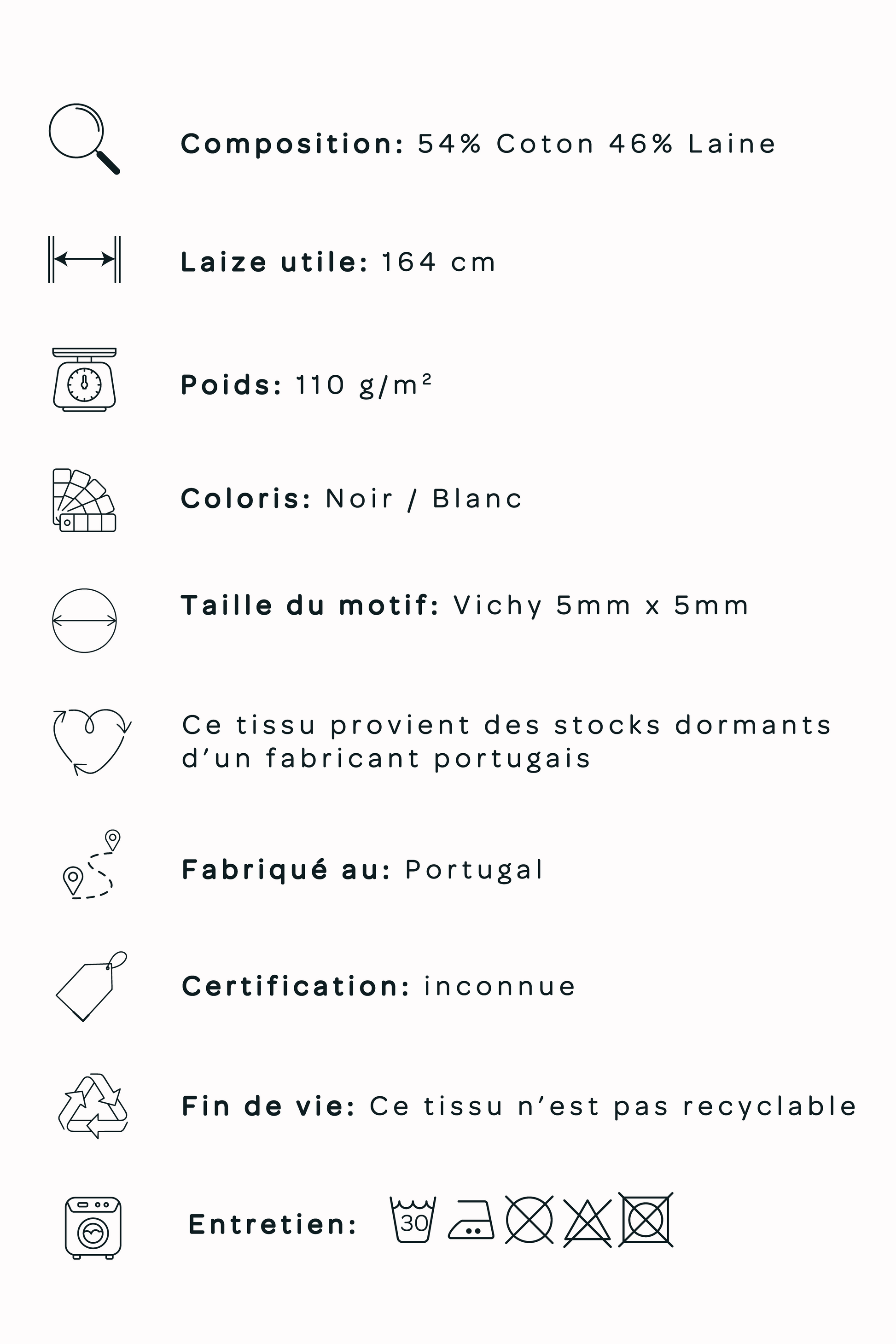 Avec son petit motif vichy noir et blanc, ce tissu sera facile à associer, et donnera une allure intemporelle à vos créations.