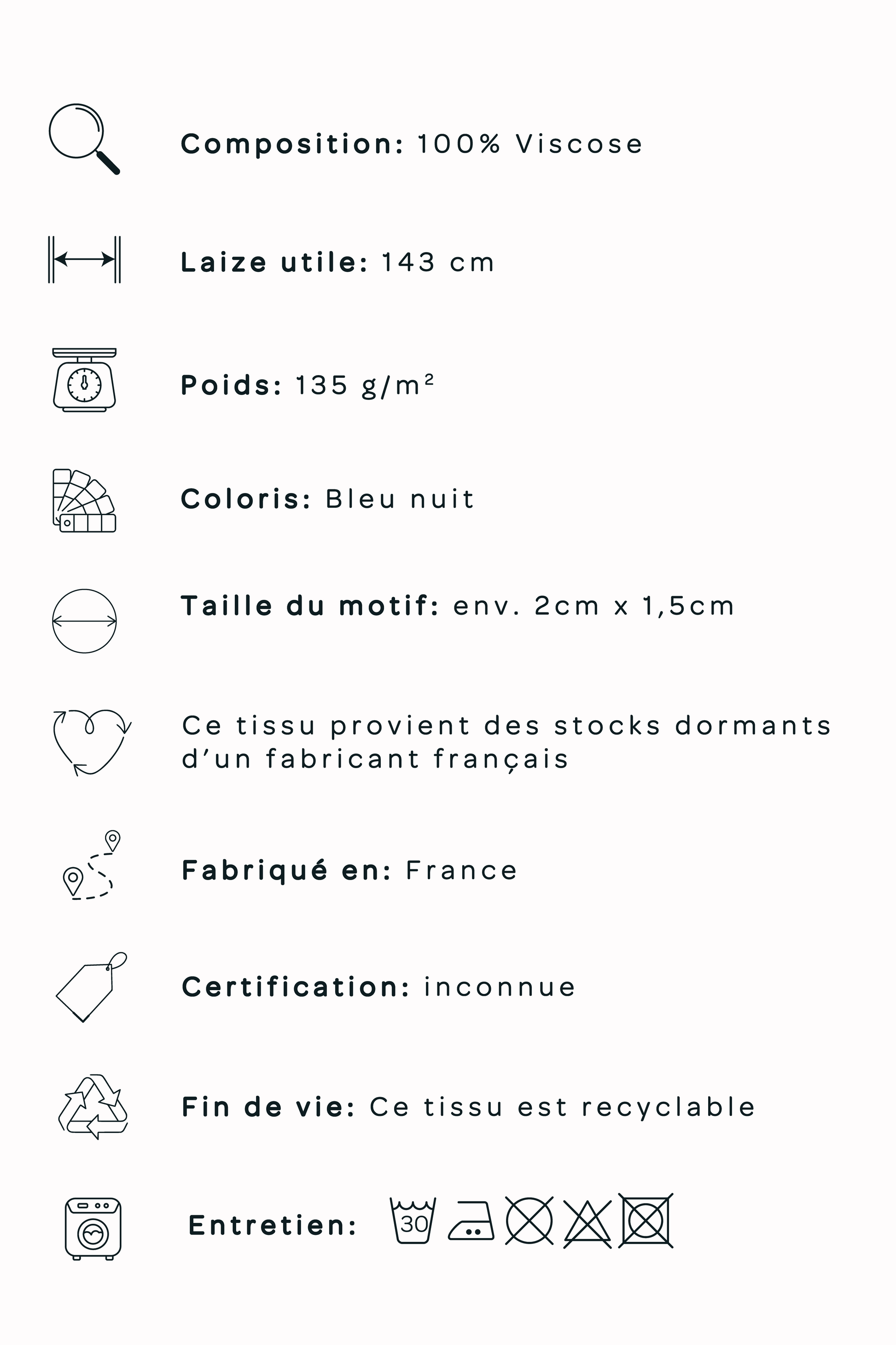 Ce jacquard de viscose, avec son motif floral en ton sur ton, son coloris bleu nui intemporel, vous permettront de coudre des pièces fluides et élégantes.