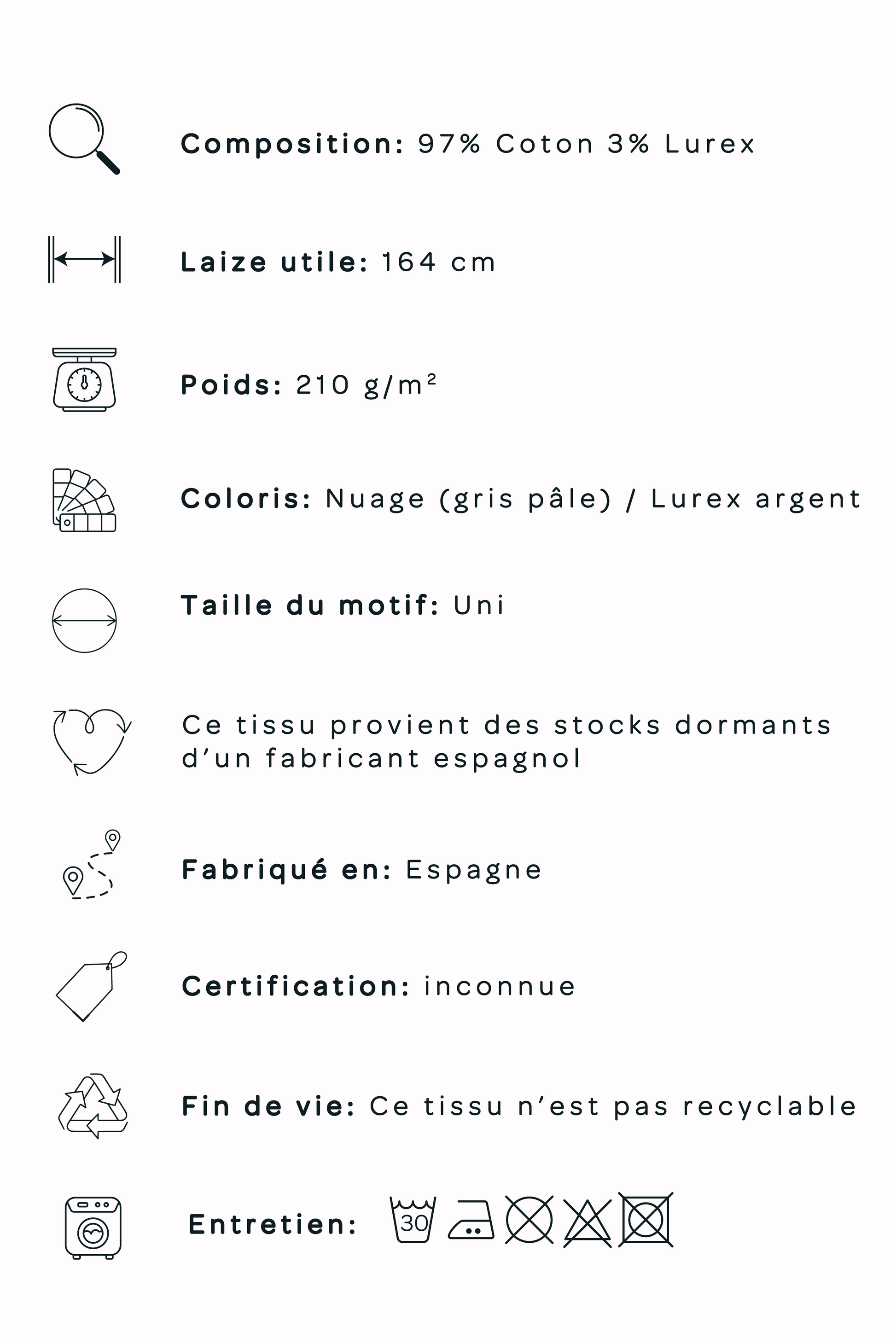 Ce molleton sweat léger (ou French Terry) avec sa nuance gris nuage, et sa texture moelleuse (envers bouclettes), vous permettra de coudre des pièces confortables.