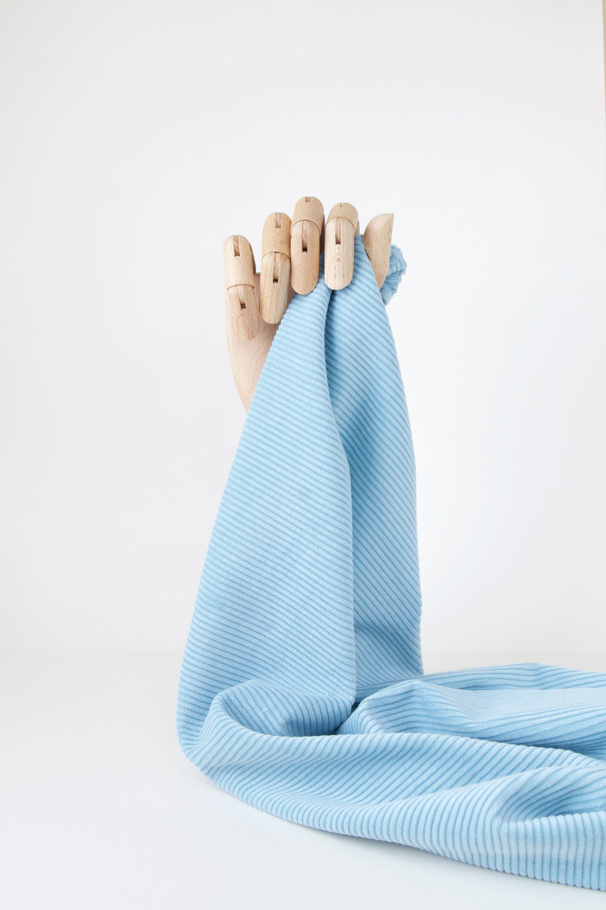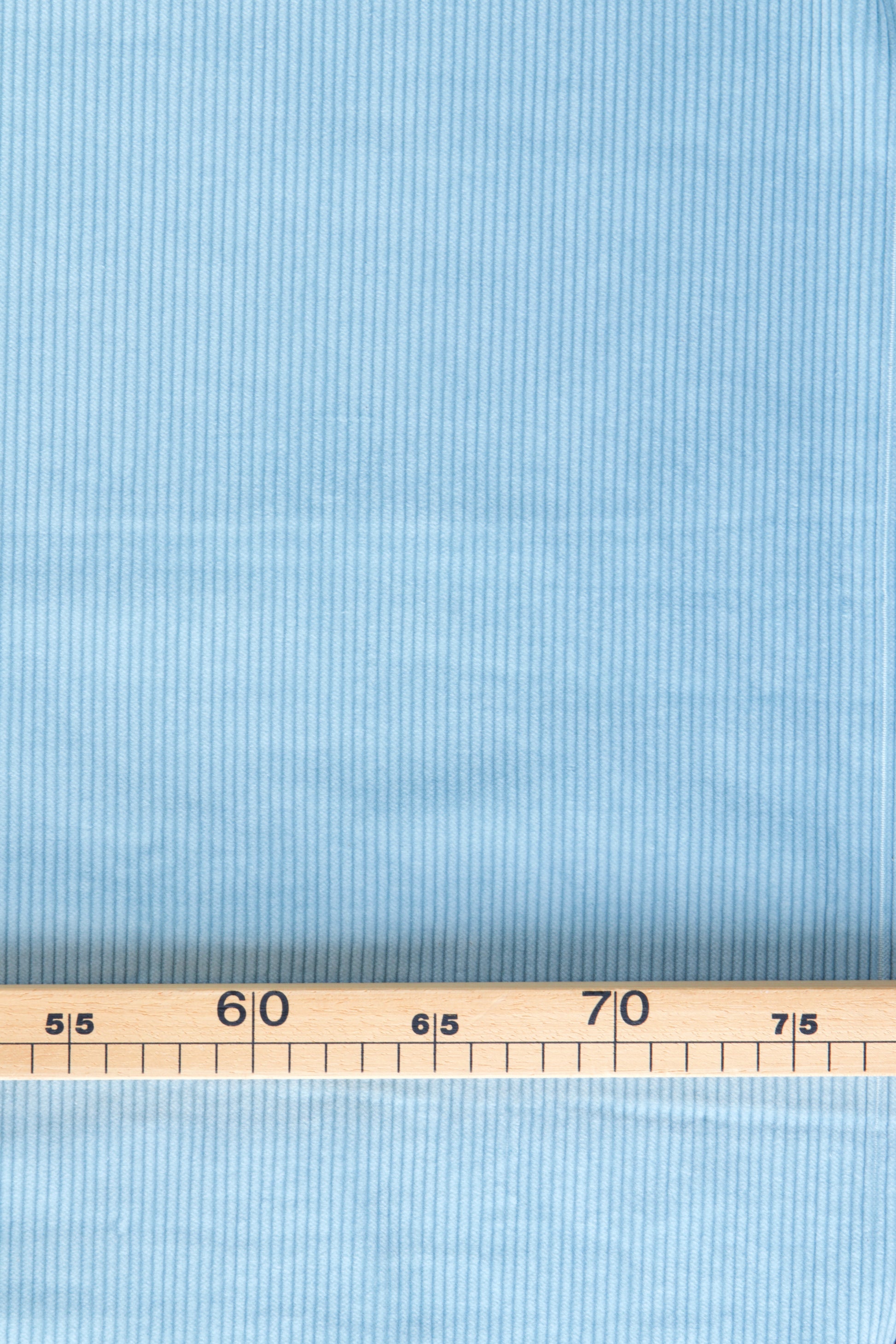 Ce velours côtelé, avec sa nuance bleu glacier, est d'une douceur infinie.