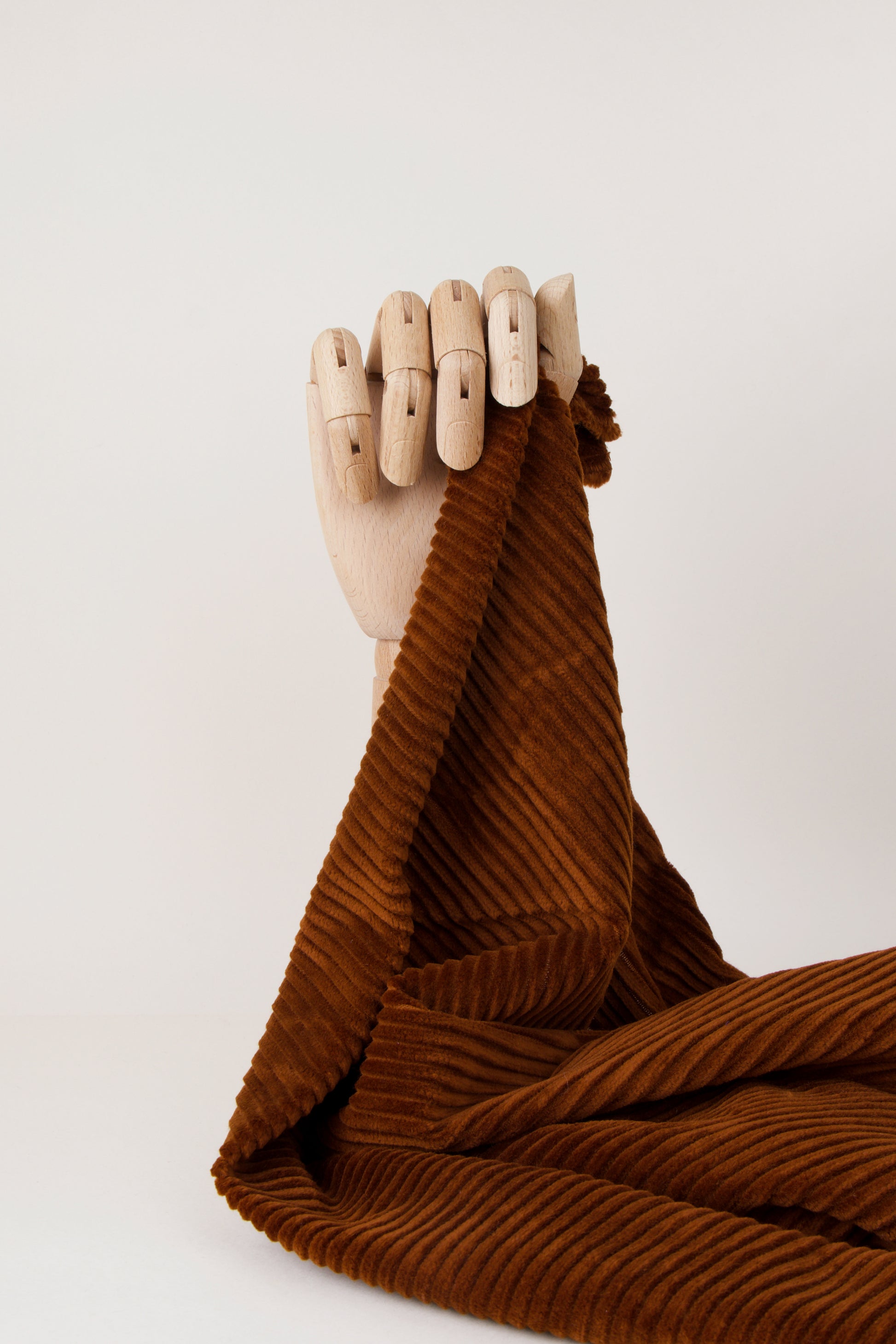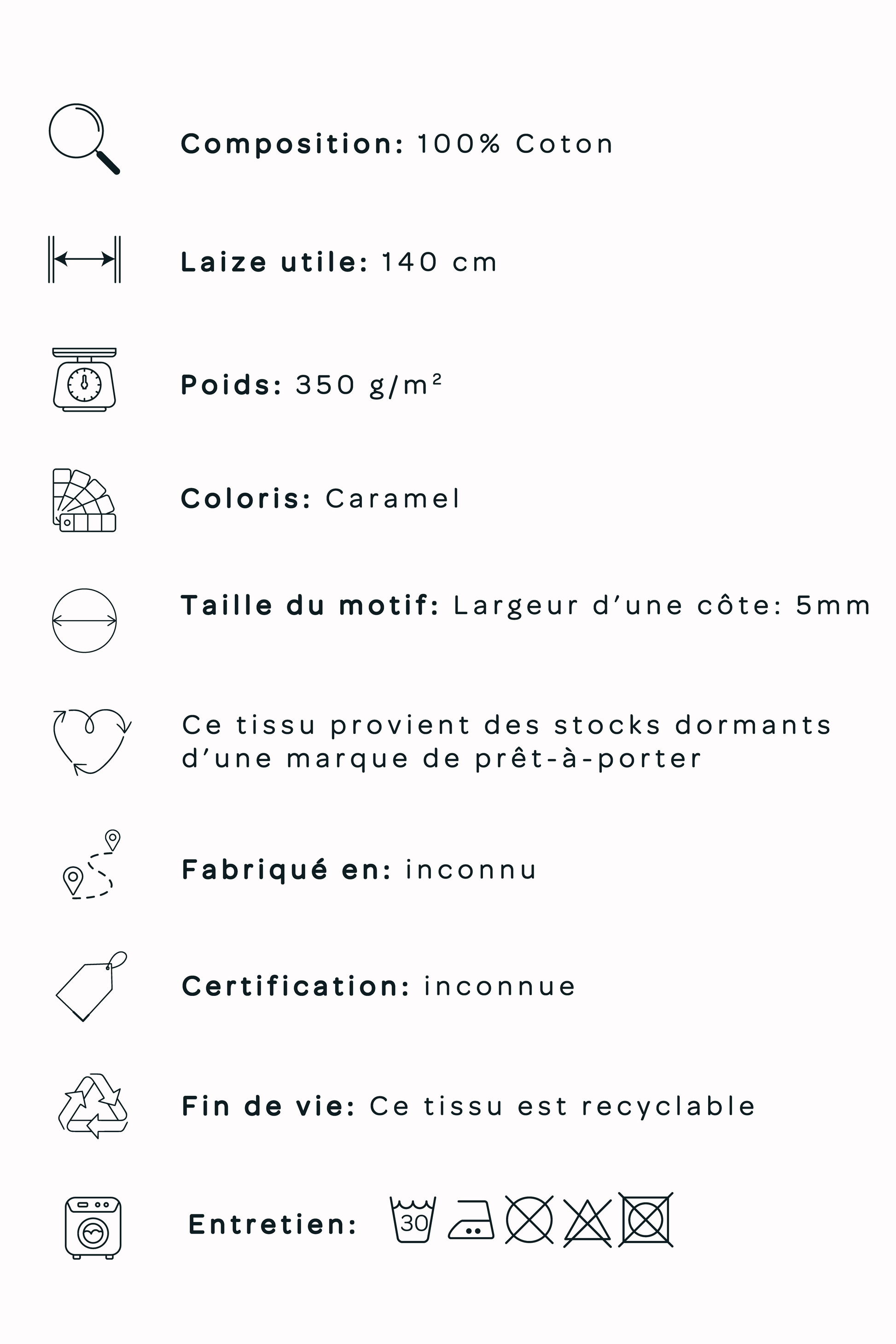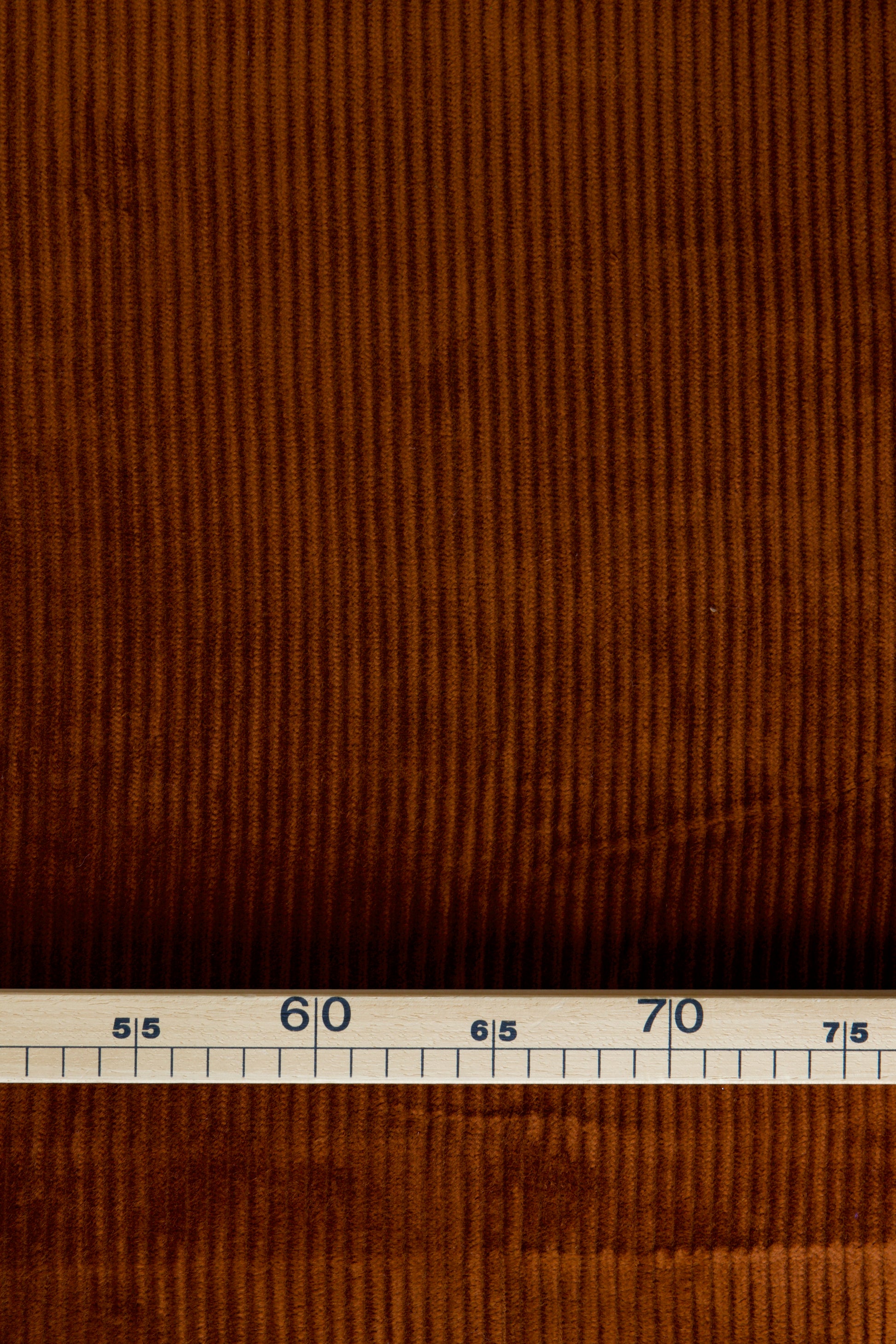 Ce velours côtelé (500 raies), avec sa nuance chaude et lumineuse de marron caramel, est d'une douceur infinie.